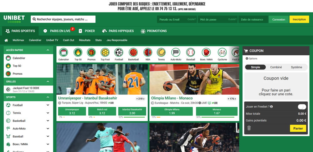 Les options de paris sportifs sont multiples, et ce, sur chaque match. La plupart des sports sont disponibles, que ce soit le tennis, le basketball, le football, le cyclisme, les sports d’hiver ou autre. Les grandes compétitions sont aussi présentes pour le bonheur de tous. Unibet est un géant des paris sportifs et il le prouve encore une fois.